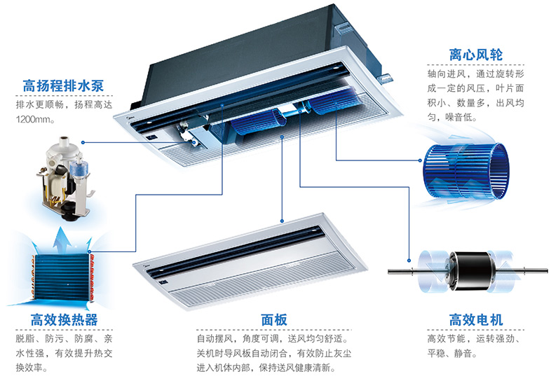 精致小巧的外形设计,能与室内装潢和谐搭配,特别适合层高有限,面积较小的房间(如儿童房,书房,工人房等);不需要任何形式的吊顶,为安装带来极大便利,轻松享受中央空调生活。