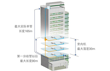 ◎美的商用中央空调最大实际单管长度165m,最大等效单管长度190m,最大配管总长1000m;